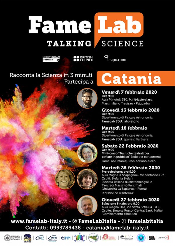 Venerdì 7 febbraio, a partire dalle 9, nell'aula "Minutoli" della Scuola Superiore di Catania a Villa San Saverio (Via Valdisavoia 9, Catania), si svolge la mini-masterclass dell'edizione catanese 2020 di FameLab - la competizione internazionale per giovani ricercatori scientifici con il talento della comunicazione - che anche quest'anno fa tappa a Catania.