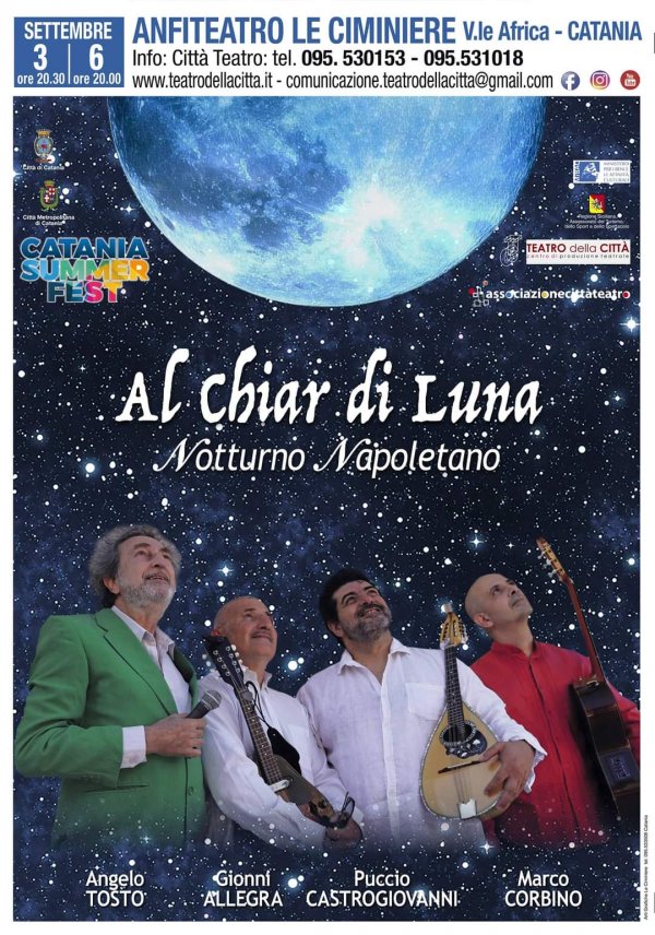 Giovedì 3 e domenica 6 settembre, nell'Anfiteatro del Centro Fieristico Le Ciminiere, va in scena "Al chiar di luna - Notturno napoletano", con l'attore Angelo Tosto e i musicisti del gruppo folk "I Lautari" Gionni Allegra, Puccio Castrogiovanni e Marco Corbino.