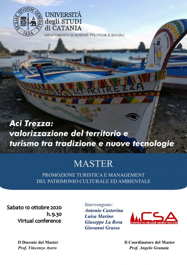 Sabato 10 ottobre a partire dalle 9.30, su piattaforma MS Teams, si svolge la conferenza virtuale sul tema "Aci Trezza: valorizzazione del territorio e turismo tra tradizione e nuove tecnologie", organizzata nell'ambito delle attività del Master in Promozione turistica e management del patrimonio culturale e ambientale (Dipartimento di Scienze politiche e sociali).