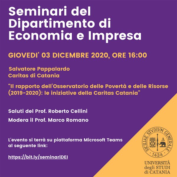 Giovedì 3 dicembre alle 16, sulla piattaforma Microsoft Teams, si svolge il webinar "Il rapporto dell’Osservatorio delle Povertà e delle Risorse (2019-2020): le iniziative della Caritas Catania", il primo di un ciclo di seminari organizzati dal Dipartimento di Economia e Impresa per il mese di dicembre.