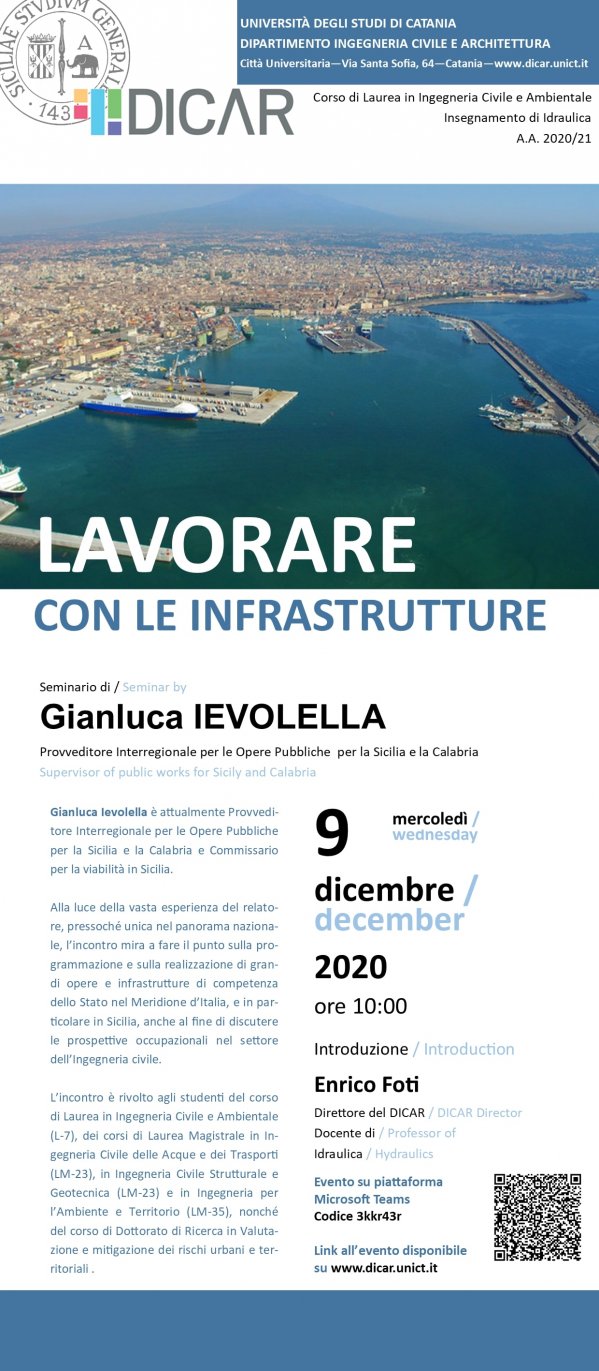 Mercoledì 9 dicembre alle 10, sulla piattaforma Microsoft Teams (codice: 3kkr43r), si svolge il seminario online "Lavorare con le infrastrutture", relatore Gianluca Ievolella, Provveditore Interregionale per le Opere Pubbliche per la Sicilia e la Calabria.