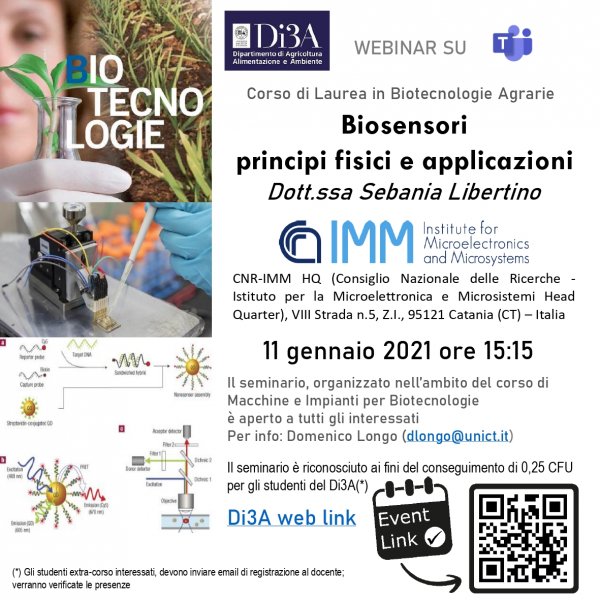 Il seminario, organizzato nell’ambito del corso di laurea in Biotecnologie agrarie (Dipartimento di Agricoltura Alimentazione e Ambiente) - sarà tenuto da Sebania Libertino, Consiglio Nazionale delle Ricerche - Istituto per la Microelettronica e Microsistemi Head Quarter) nell'ambito dell'insegnamento di "Macchine e Impianti per Biotecnologie".