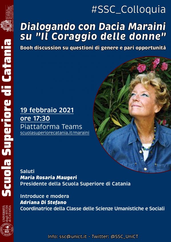 Venerdì 19 febbraio alle 17.30, sulla piattaforma Microsoft Teams, la scrittrice Dacia Maraini è protagonista di un incontro su questioni di genere e pari opportunità, organizzato dalla Scuola Superiore di Catania (SSC).