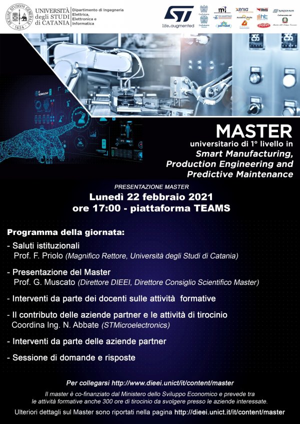 Lunedì 22 febbraio alle 17, sulla piattaforma Microsoft Teams, si svolge la presentazione del master di 1°livello in "Smart manufacturing, production and predictive maintenance", promosso dal Dipartimento di Ingegneria elettrica elettronica e informatica (Dieei).