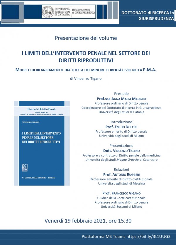 Oltre all'autore, intervengono Antonio Ruggieri (Professore emerito di Diritto costituzionale, Università degli studi di Messina) e Francesco Viganò (Giudice della Corte costituzionale e docente di Diritto penale, Università Bocconi di Milano). Presiede Anna Maria Maugeri (Coordinatore del Dottorato e docente di Diritto penale), introduce Emilio Dolcini (professore emerito di Diritto penale, Università degli studi di Milano).