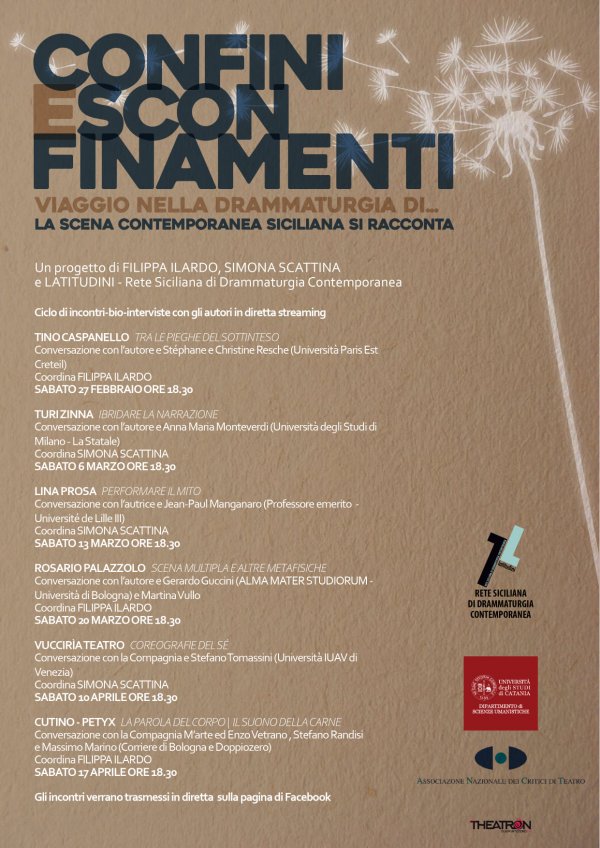 Sabato 17 aprile alle 18:30, online sulla pagina Facebook della rete Latitudini, si conclude la rassegna di incontri e conversazioni "Confini e sconfinamenti - Viaggio nella drammaturgia di...", incentrati sulla scena contemporanea siciliana.