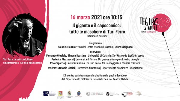 Martedì 16 marzo alle 10:15, sulle pagine Facebook del Dipartimento di Studi umanistici (Disum) e del Teatro Stabile di Catania, si svolge il seminario "Il gigante e il capocomico: tutte le maschere di Turi Ferro", organizzato dal Disum in collaborazione con il Centro ricerche su attore e divismo dell’Università di Torino (CRAD).