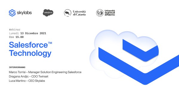 Lunedì 13 dicembre alle 15, online su piattaforma Zoom, si svolge il webinar di presentazione “Salesforce Technology”, nuovo appuntamento dell'iniziativa "Skylabs Academy" che, per il terzo anno consecutivo, propone gratuitamente agli studenti dei Dipartimenti di Matematica e Informatica e di Ingegneria elettrica, elettronica e informatica dell’Università di Catania, un ciclo di alta formazione professionale.