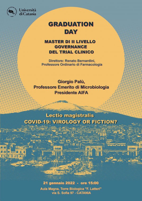 Venerdì 21 gennaio alle 15, nell'aula magna della Torre Biologica "Ferdinando Latteri" (via Santa Sofia, 97), il professore Giorgio Palù, emerito di Microbiologia all'Università di Padova e presidente dell'Agenzia Italiana del Farmaco, tiene la lectio magistralis "COVID-19: virology or fiction?"