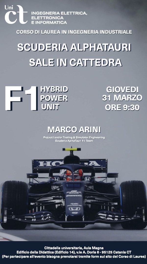 Giovedì 31 marzo alle 9:30, nell’aula magna dell’Edificio per la Didattica di Ingegneria (Ed. 14, Città Universitaria), l’ing Marco Arini (Project Leader Testing&Simulator Engineering, Scuderia AlphaTauri F1 Team) tiene la lecture dal titolo "F1 Hybrid Power Unit".
