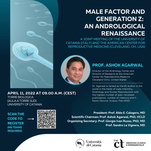 Lunedì 11 aprile alle 9, nell'aula A della Torre Biologica "Ferdinando Latteri" (Torre Sud, Via Santa Sofia, 89), si svolge l'incontro dal titolo “Male factor and generation Z: an andrological renaissance”, relatore Ashok Agarwal, direttore dell’American Center for Reproductive Medicine di Cleveland (USA).