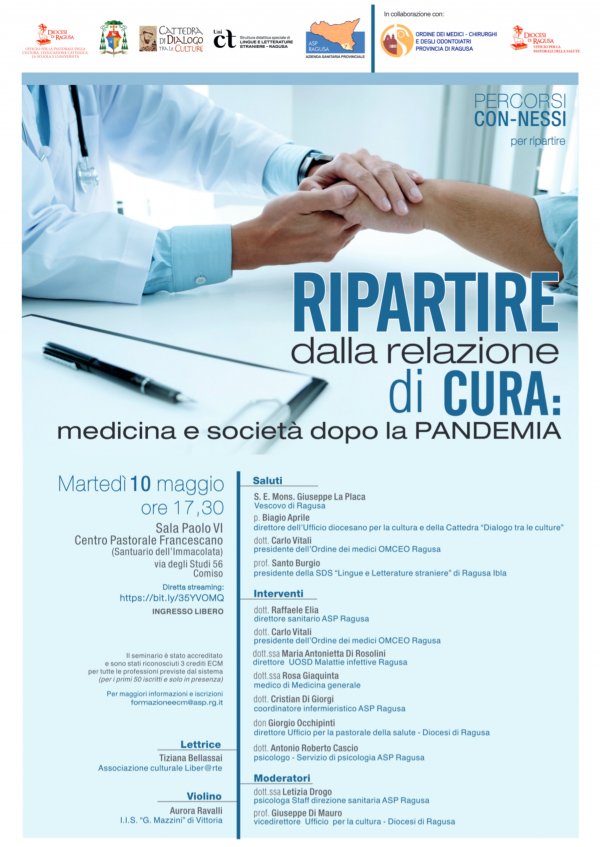 Martedì 10 maggio alle 10:30, nella sala "Paolo VI" del Centro pastorale francescano per il dialogo e la pace di Comiso (Santuario dell’Immacolata, via degli studi 56), si svolge il seminario "Ripartire dalla relazione di cura: medicina e società dopo la pandemia", terzo appuntamento del ciclo "Percorsi con-nessi per ripartire", promossi dall’Ufficio per la cultura della Diocesi di Ragusa, dalla Cattedra di Dialogo tra le culture e dall’Università di Catania (sede di Ragusa Ibla).