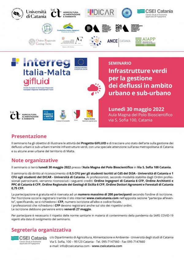 Il seminario ha gli obiettivi di illustrare le attività del progetto e di tracciare uno stato dell’arte sulla gestione dei deflussi urbani e sub-urbani tramite infrastrutture verdi, con una speciale attenzione sull’area metropolitana di Catania e su alcune aree urbane del territorio di Malta.