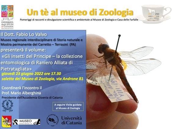 Giovedì 23 giugno alle 17:30, nella saletta del Museo di Zoologia (via Androne 81), si svolge l'incontro "Gli insetti del Principe - La collezione entomologica di Raniero Alliata di Pietratagliata", relatore Fabio Lo Valvo (Museo regionale interdisciplinare di Storia naturale e Mostra permanente del carretto - Terrasini).