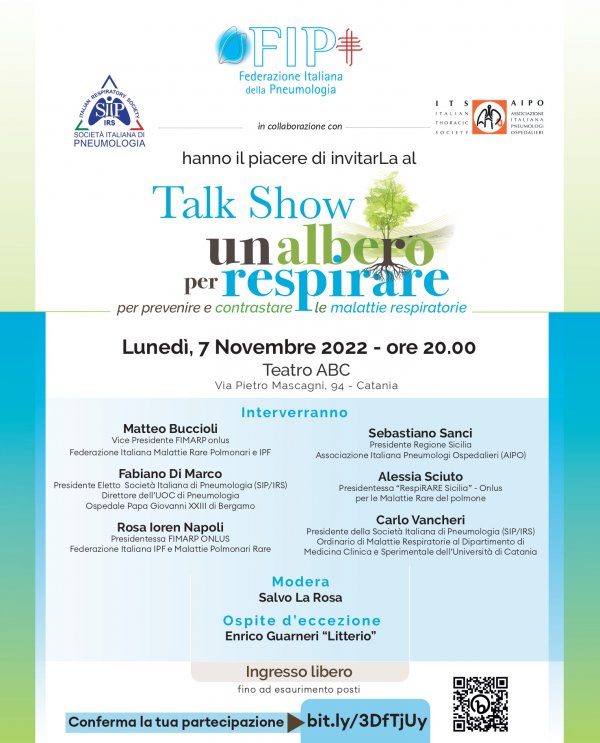 Lunedì 7 novembre alle 20, al Teatro ABC (via Pietro Mascagni 94, Catania), si svolge il talk show "Un albero per respirare, per prevenire e contrastare le malattie respiratorie", organizzato dalla Federazione Italiana della Pneumologia (FIP) in collaborazione con la Società Italiana di Pneumologia (SIIP) e l'Associazione Italiana Pneumologi Ospedalieri (AIPO).