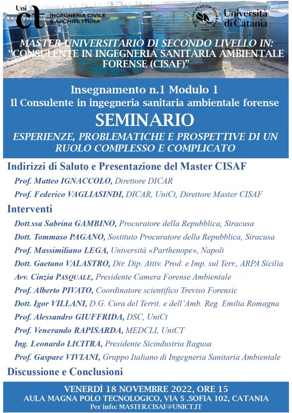 Venerdì 18 novembre alle 15, nell'aula magna del Polo Tecnologico (via S. Sofia 102, Catania), si svolge l'evento "Esperienze, problematiche e prospettive di un ruolo complesso e complicato", seminario di apertura del master di II livello in "Consulente in Ingegneria sanitaria ambientale forense (CISAF)", promosso dal Dipartimento di Ingegneria civile e Architettura.