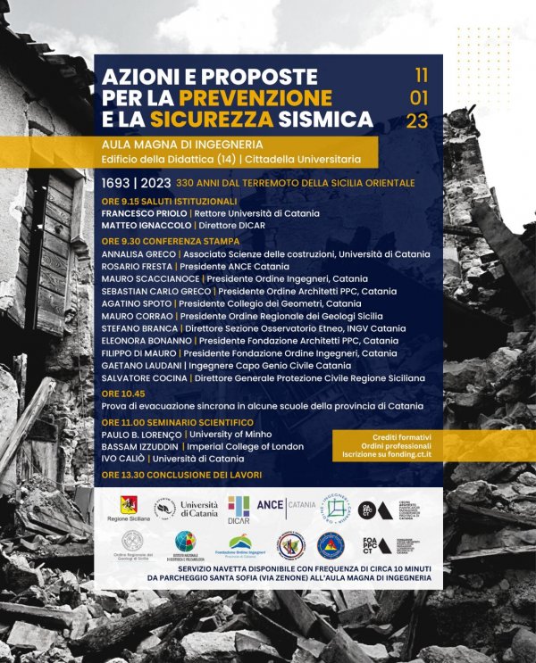 Mercoledì 11 gennaio alle 9, nell’ aula magna dell'Edificio per la didattica di Ingegneria (Cittadella Universitaria), si svolge il convegno "Azioni e proposte per la prevenzione e la sicurezza sismica", organizzato dal Dipartimento di Ingegneria Civile e Architettura in occasione del 330° anniversario del terremoto che distrusse la Sicilia orientale.