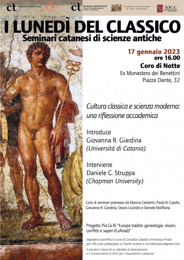 Martedì 17 gennaio alle 16, al Coro di notte del Monastero dei Benedettini di Catania, si svolge il seminario dal titolo "Cultura classica e scienza moderna: una riflessione accademica", sesto incontro del ciclo “I lunedì del classico” organizzato dai docenti Monica Centanni, Paolo B. Cipolla, Giovanna Giardina, Orazio Licandro e Daniele Malfitana.