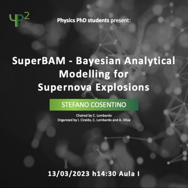 Lunedì 13 marzo alle 14:30, nell'aula I del Dipartimento di Fisica e Astronomia "Ettore Majorana" (via S. Sofia 64, Catania), Stefano Cosentino, dottorando in Fisica, terrà un seminario dal titolo "SuperBAM: Bayesian Analytical Modelling for Supernova Explosions".