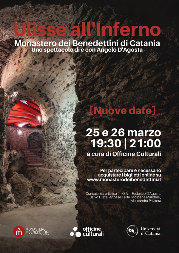 Sabato 25 e domenica 26 marzo, alle 19:30 e alle 21, nelle cantine settecentesche del Monastero dei Benedettini di Catania va in scena “Ulisse all’inferno”, spettacolo di e con Angelo D’Agosta a cura di Officine Culturali.