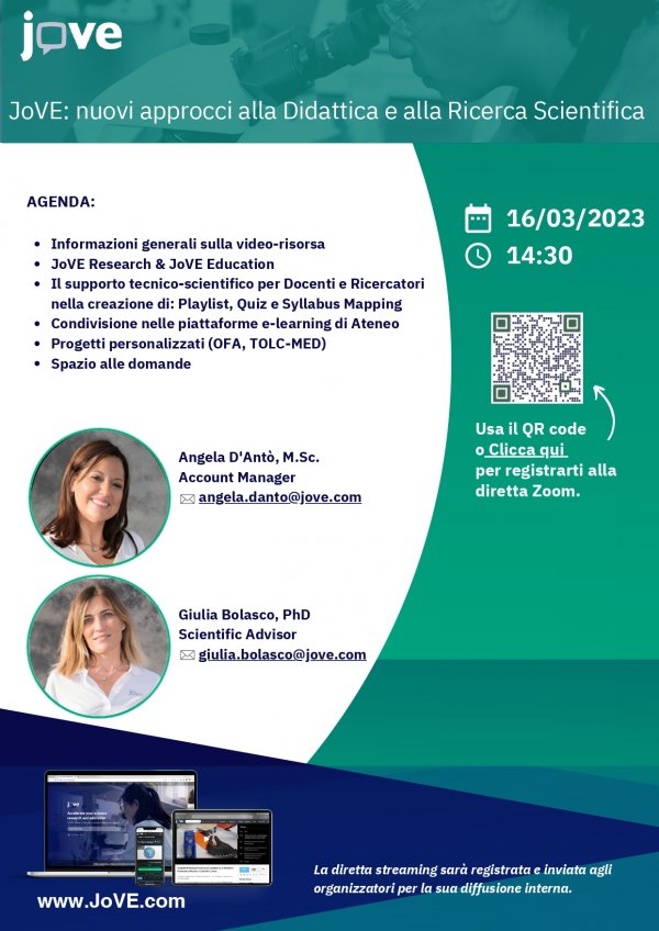 Giovedì 16 marzo alle 14:30, sulla piattaforma Zoom, si svolge il seminario online "JoVE: nuovi approcci alla Didattica e alla Ricerca Scientifica", organizzato dall'azienda americana JoVE.