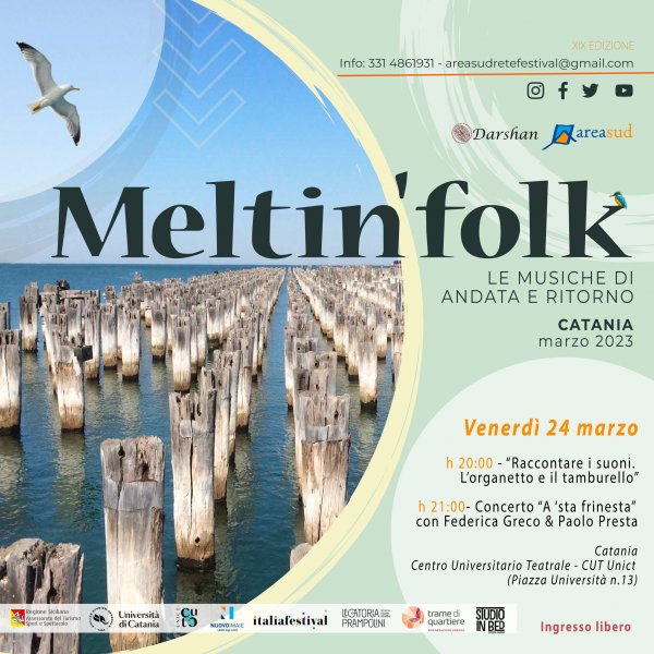 Venerdì 24 marzo alle 20, al CUT - Centro Universitario Teatrale dell'Università di Catania appuntamento con i musicisti Federica Greco e Paolo Presta nell'ambito della rassegna "Meltin'folk - Le musiche di andata e ritorno".