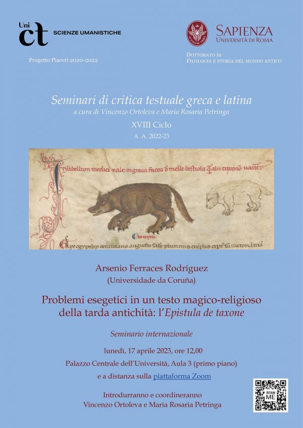 Lunedì 17 aprile alle 12, nell’Aula 3 del Palazzo Centrale dell’Università e online su Zoom, si svolge il seminario dal titolo "Problemi esegetici in un testo magico-religioso della tarda antichità: l'Epistula de taxone", organizzato nell'ambito del XVIII ciclo di Seminari di critica testuale greca e latina promosso dal Dipartimento di Scienze umanistiche.