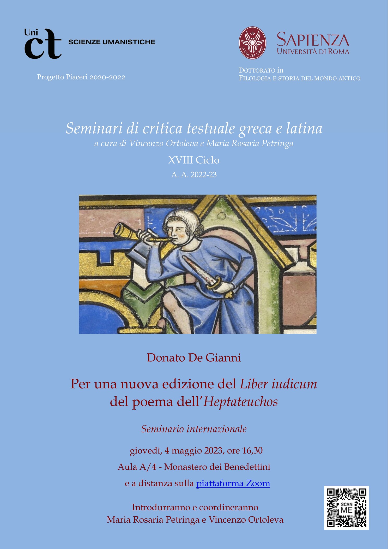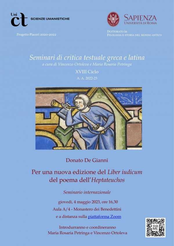 Giovedì 4 maggio alle 16:30, nell'aula A4 del Monastero dei Benedettini e online su Zoom, si svolge il seminario dal titolo "Per una nuova edizione del Liber iudicum del poema dell'Heptateuchos", organizzato nell'ambito del XVIII ciclo di Seminari di critica testuale greca e latina promosso dal Dipartimento di Scienze umanistiche.