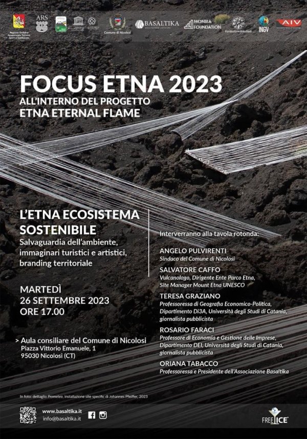 Etna Eternal Flame e gli appuntamenti collaterali sono organizzati dall’Associazione Culturale Basaltika in collaborazione con Monira Foundation di New York e Fondazione Orestia di Gibellina, con il patrocinio dell’Ente Parco Etna e del Comune di Nicolosi ed il sostegno scientifico di Ingv e AIV (Associazione Italiana di Vulcanologia).