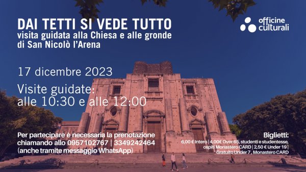 Domenica 17 dicembre alle 10:30 e alle 12, si svolge la visita guidata alla Chiesa e alle gronde di San Nicolò l’Arena. Progettata da GianBattista Contini nel 1687 e costruita a partire dal 1702, con le sue tre navate, l’organo di Del Piano e la meridiana di Peter e Sartorius, la Chiesa è ancora oggi uno dei luoghi più affascinanti della città di Catania. Durante la visita guidata si scoprirà la storia delle sue architetture e si proseguirà la una passeggiata sui camminamenti di gronda. Dai tetti costruiti sul punto più alto della città, a cui si accede percorrendo i 141 gradini di una celata scala a chiocciola, sarà possibile osservare il centro storico, il mare e l’Etna.