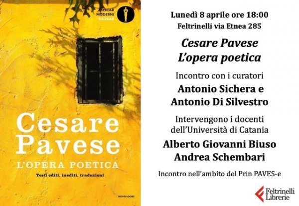 Lunedì 8 aprile alle 18, alla Libreria Feltrinelli di Via Etnea (Catania), si svolge la presentazione del volume "Cesare Pavese. L’opera poetica. Testi editi, inediti, traduzioni" a cura di Antonio Sichera e Antonio Di Silvestro.
