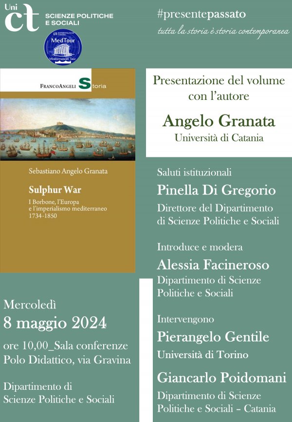 Mercoledì 8 maggio alle 10, nell’aula conferenze del Polo didattico del Dipartimento di Scienze politiche e sociali (via Gravina 12) si svolge la presentazione del volume Sulphur War. I Borbone, l'Europa e l'imperialismo mediterraneo 1734-1850 (FrancoAngeli, 2023) di Sebastiano Angelo Granata (Università di Catania). Dopo i saluti istituzionali di Pinella Di Gregorio (Direttore del DSPS), discuteranno con l’autore Giancarlo Poidomani (Università di Catania) e Pierangelo Gentile (Università di Torino). L’incontro sarà moderato da Alessia Facineroso (Università di Catania).