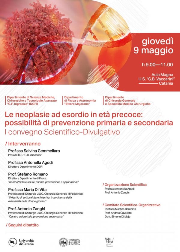 Giovedì 9 maggio alle 9, nell'aula magna dell'IIS "G.B. Vaccarini" (via Orchidea 9, Catania), si svolge il convegno scientifico - divulgativo "Le neoplasie ad esordio in età precoce: possibilità di prevenzione primaria e secondaria", organizzato dai dipartimenti di Scienze mediche, Chirurgiche e Tecnologie avanzate "G.F. Ingrassia", Fisica e Astronomia "E. Majorana" e di Chirurgia generale e Specialità medico-chirurgiche dell'Università di Catania.