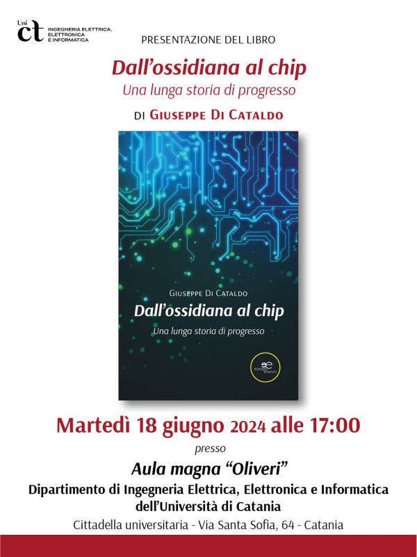 Martedì 18 giugno alle 17, nell'aula magna "Oliveri" dell'Edificio 4 di Ingegneria (Città Universitaria, via Santa Sofia 64, Catania), si svolge la presentazione del libro "Dall'ossidiana al chip. Una lunga storia di progresso" (Europa Edizioni), di Giuseppe Di Cataldo, organizzata dal Dipartimento di Ingegneria elettrica, elettronica e informatica (DIEEI).