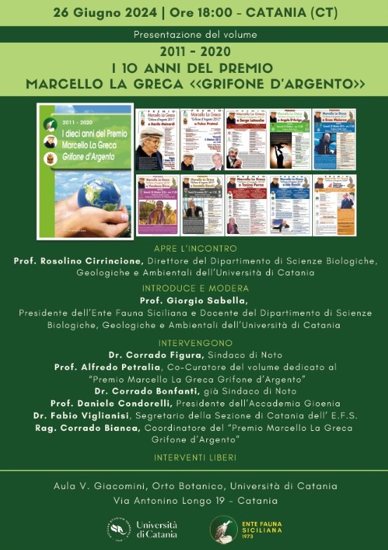 Mercoledì 26 giugno alle 18, nell'aula "Giacomini" dell'Orto Botanico dell'Università di Catania (via Antonio Longo 19, Catania), si svolge la presentazione del volume "2011-2020. I 10 anni del premio Marcello La Greca «Grifone d'argento»", a cura dell'Ente Fauna Siciliana.