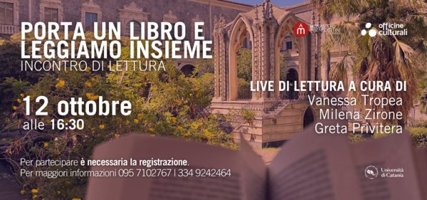 Sabato 12 ottobre alle 16:30 al Monastero dei Benedettini, Officine culturali ospita “Porta un libro e leggiamo insieme”, incontro di lettura collettiva a cura di Milena Lucia Zirone, Greta Privitera e Vanessa Tropea.