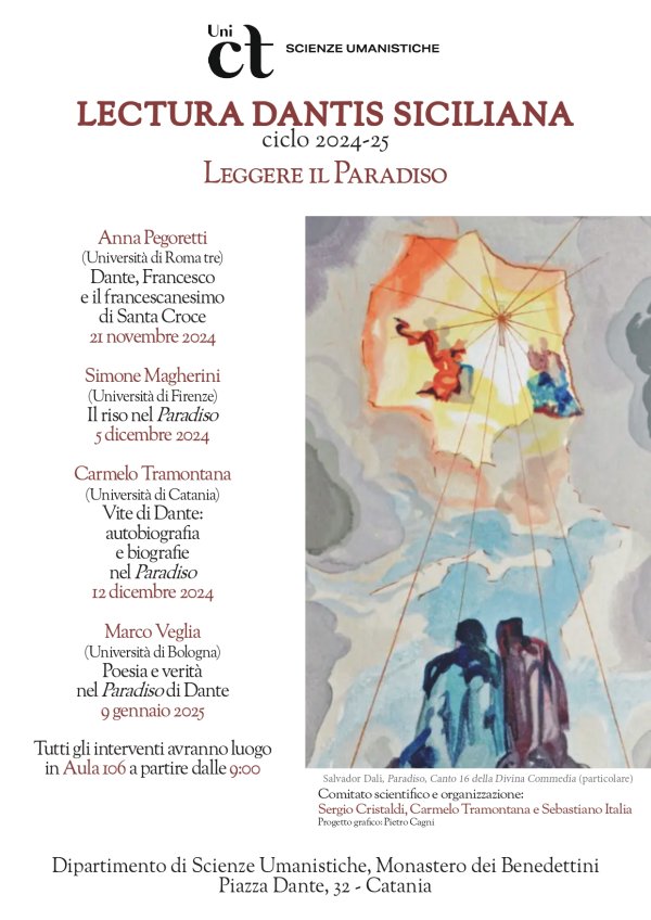 Giovedì 5 dicembre alle 9, nell'aula 106 del Monastero dei Benedettini, si tiene il secondo incontro del ciclo 2024/25 della "Lectura Dantis Siciliana": Leggere il Paradiso, organizzato dal Dipartimento di Scienze umanistiche dell'Università di Catania.
