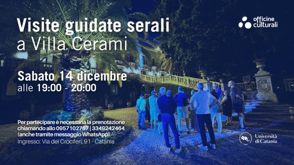 Sabato 14 dicembre alle 19, alle 20 e alle 21 (un tour guidato ogni ora) a Villa Cerami, si svolgono le visite guidate serali a cura di Officine Culturali per scoprire in notturna la storia di uno dei palazzi storici dell’Università di Catania.