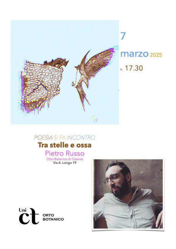 Venerdì 7 marzo alle 17:30, all'Orto Botanico dell'Università di Catania, si svolge l'evento "Tra stelle e ossa", quarto appuntamento di "Poesia si fa incontro", progetto ideato insieme ad alcuni poeti catanesi, in programma fino al 14 marzo. Interverrà Pietro Russo.