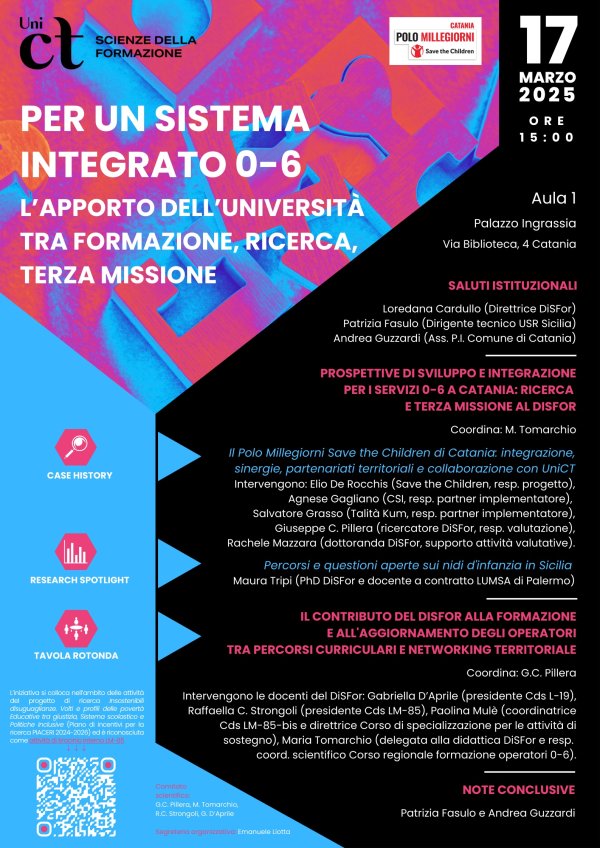 L’evento vede il coinvolgimento del Polo Millegiorni di Catania di Save the Children, che ha affidato all’Università di Catania la valutazione del progetto, e la partecipazione dell’Ufficio Scolastico Regionale per la Sicilia, dell’Assessore alla Pubblica Istruzione del Comune di Catania, dei Presidenti/Coordinatori dei nostri corsi di studio e percorsi professionalizzanti di area educativa, della Prof.ssa Maura Tripi della LUMSA di Palermo.