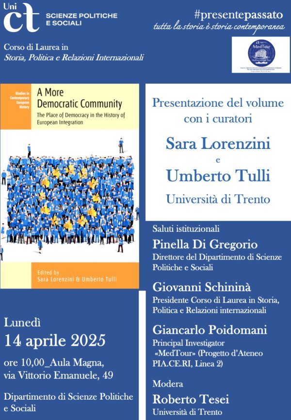 Lunedì 14 aprile alle 10, nell'aula magna di Palazzo Pedagaggi (via Vittorio Emanuele II, 51), si svolge la presentazione del volume "A more democratic community: the place of democracy in the history of european integration", a cura di Sara Lorenzini e Umberto Tulli (Università di Trento).