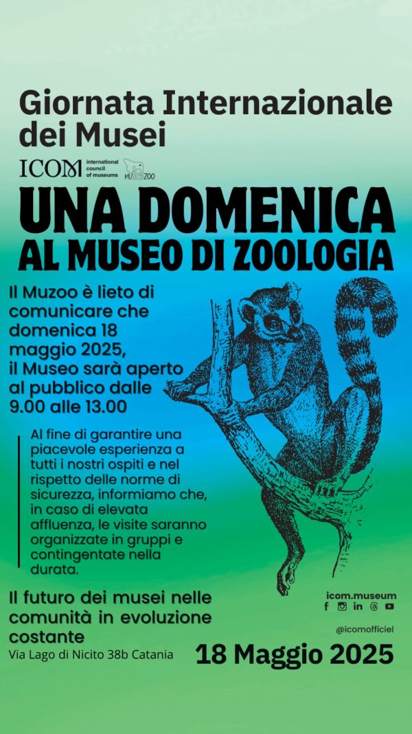 Domenica 18 maggio dalle 9:30 alle 13:00, al Museo di Zoologia e Casa delle Farfalle dell'Università di Catania (via Lago di Nicito, 38b - Catania), si svolge l'iniziativa "Una domenica al Museo di Zoologia", che prevede l'apertura straordinaria del Museo in occasione della Giornata Internazionale dei Musei 2025.