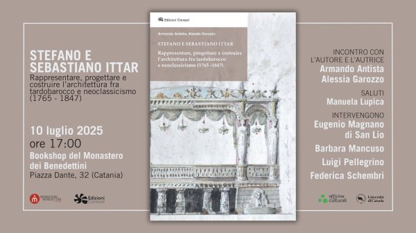 Giovedì 10 luglio alle 17, al bookshop del Monastero dei Benedettini di Catania si tiene, a cura di Officine Culturali, la presentazione del volume “Stefano e Sebastiano Ittar - Rappresentare, progettare e costruire l’architettura fra tardobarocco e neoclassicismo (1765-1847)” (edizioni Caracol), di Armando Antista e Alessia Garozzo.