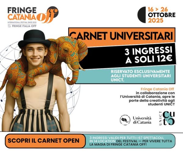 - Catania Off Fringe Festival 2025: Dal 16 al 26 ottobre, Catania ospita la quarta edizione del Festival internazionale del teatro off e delle arti performative. Consulta il cartellone. Scopri le tariffe ridotte Unict (16 ottobre 2025)