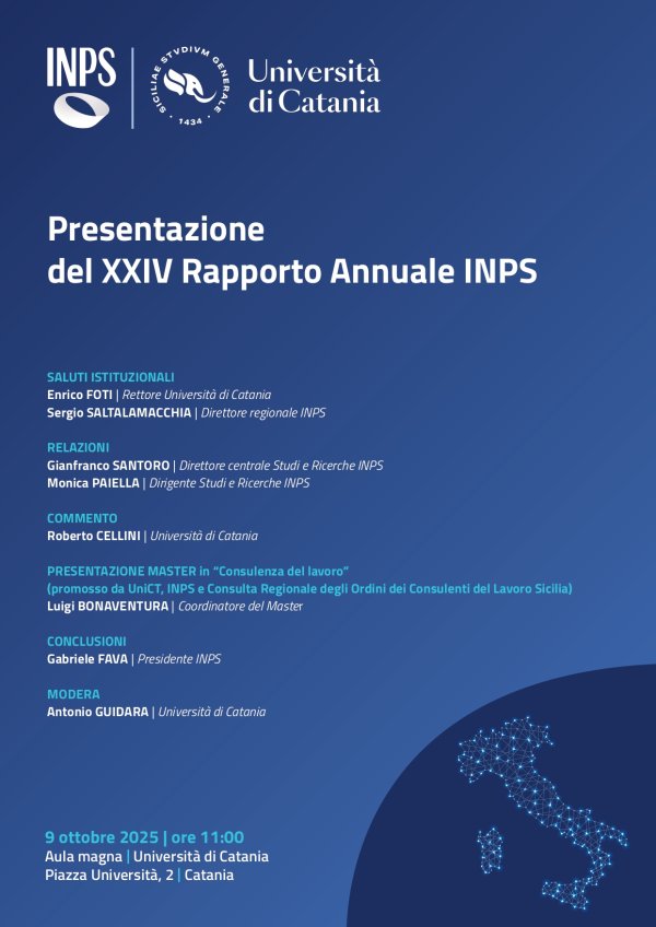 Giovedì 9 ottobre alle 11, nell’aula magna del Rettorato, si presenta il XXIV Rapporto Annuale INPS. L’incontro è moderato dal Prof. Antonio Guidara (Università di Catania) e interverrà il presidente INPS, Avv. Gabriele Fava.