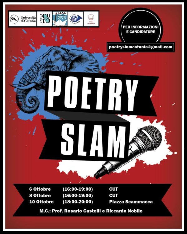 Venerdì 10 ottobre alle 18, al mercato metropolitano "Piazza Scammacca" (Piazza Scammacca, 9), si svolge la finale di "Poetry Slam", torneo di poesia rivolto prevalentemente alla comunità comunità universitaria (docenti e studenti), ma aperto a tutte le persone eventualmente interessate a partecipare.