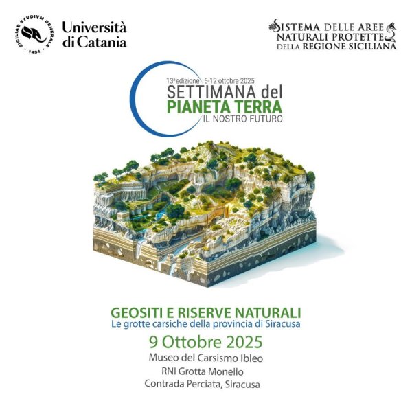 Giovedì 9 ottobre alle 10, al Museo del Carsismo Ibleo (Riserva Grotta Monello, contrada Perciata - Siracusa), l'Università di Catania promuove il seminario gratuito dal titolo “Geositi e riserve naturali: le grotte carsiche della provincia di Siracusa”, organizzato in occasione della Settimana del Pianeta Terra.