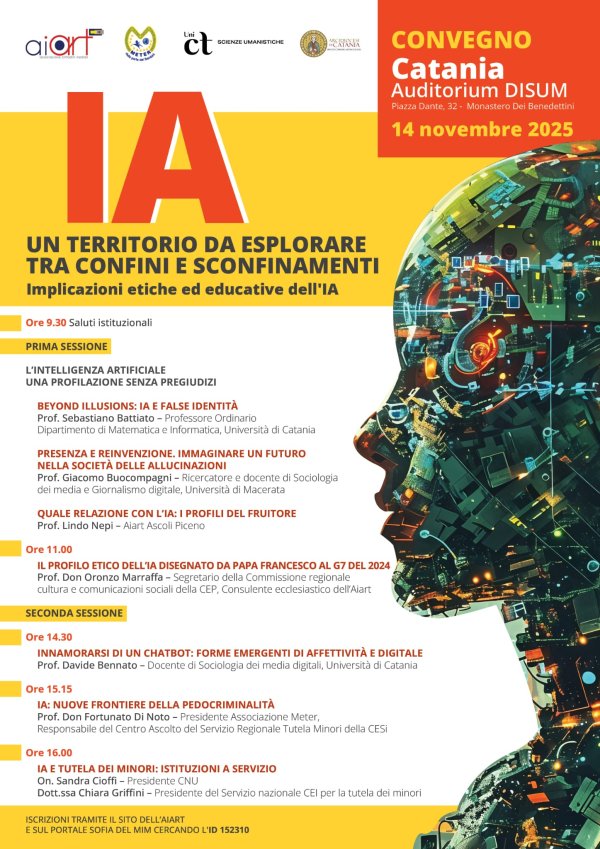 L’iniziativa, promossa da Associazione Meter, AIART – Associazione Cittadini Mediali, in collaborazione con il Dipartimento di Scienze umanistiche dell’Università di Catania e con l’Arcidiocesi di Catania, intende aprire un confronto multidisciplinare tra accademici, esperti e rappresentanti istituzionali sulle sfide poste dall’intelligenza artificiale in campo etico, educativo e sociale.