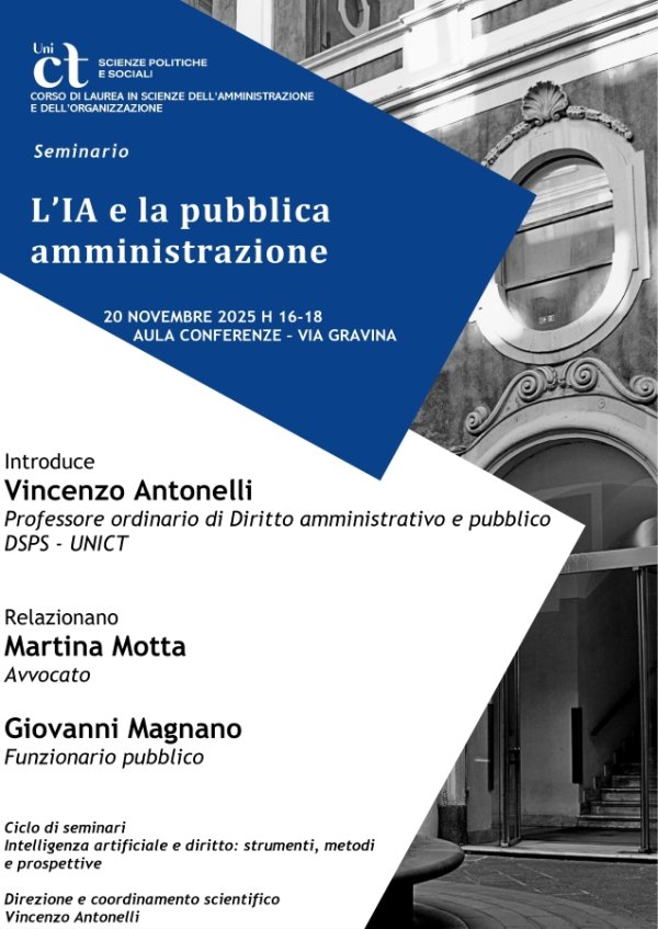 Giovedì 20 novembre alle 16, nella sala conferenze del Polo didattico "Gravina", l'avvocato Martina Motta e il funzionario pubblico Giovanni Magnano tengono il seminario dal titolo "L’IA e la pubblica amministrazione".