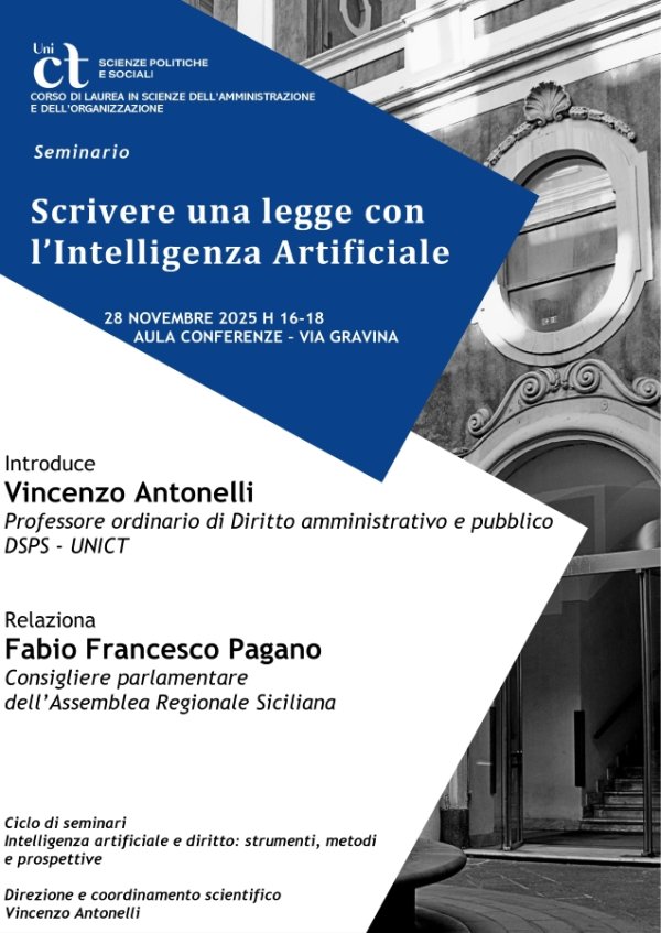 Venerdì 28 novembre alle 16, nella sala conferenze del Polo didattico "Gravina", Fabio Francesco Pagano, consigliere parlamentare dell’Assemblea Regionale Siciliana, tiene il seminario dal titolo "Scrivere una legge con l’Intelligenza Artificiale".